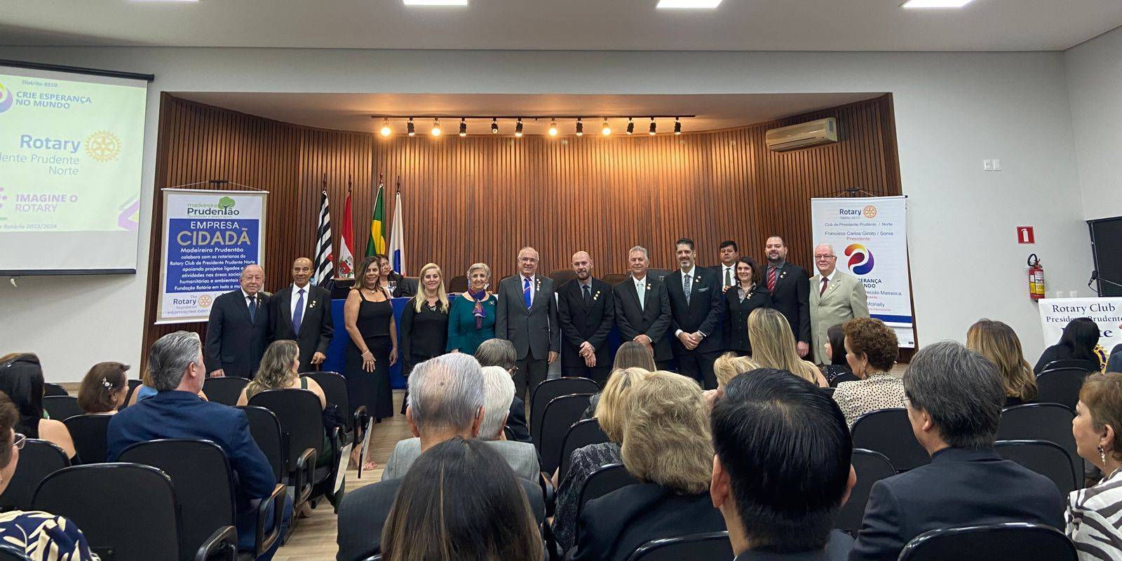 Foi realizada no último dia 04, a 1ª Reunião Ordinária de Transmissão de Cargos e posse do Conselho Diretor do ROTARY CLUB DE PRESIDENTE PRUDENTE - NORTE. na sede da OAB de Pres. Prudente. Francisco Carlos Giroto foi reconduzido ao cargo de Presidente, que após empossado e a batida do sino que simboliza a abertura do ano rotário 2023/2024 foram entregues os títulos de Companheiro Paul Harris para: Adriano Donizete Gabriel, Sonia Giroto, Camila Garcia Salles Ribeiro.